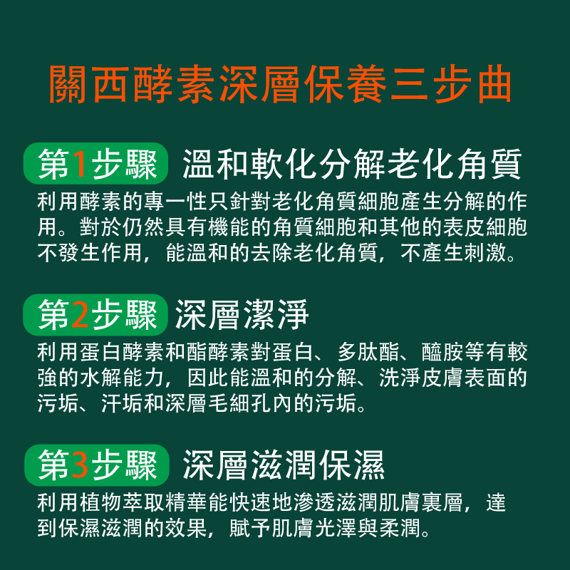 利用酵素分解的能力來溫和地軟化肌膚深層的污垢,免於用力搓揉就能輕鬆地洗淨肌膚,無負擔的去除污垢保持肌膚健康,肌膚洗淨後,再擦植萃酵素爽身粉,使肌膚表層多一層保護膜。