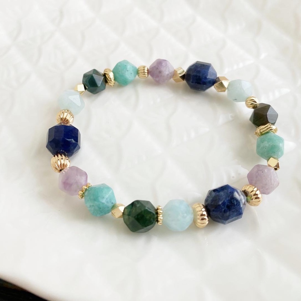 使用材料:10mm藍紋石、8mm海藍寶、天河石、薰衣草紫水晶、印度瑪瑙、14K包金珠、彈力蠶絲線。