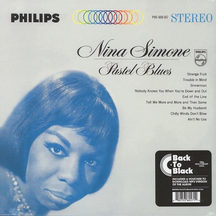 妮娜·西蒙 (Nina Simone) 將Blues視為情感而非形式,她在她的第四張Philips唱片《Pastel Blues》中找到了神聖與世俗之間的交集。 西蒙娜運用豐富的情緒和情感,涵蓋了各種各樣的歌曲:經典歌曲如“Trouble in Mind”和“Nobody Knows You When You’re Down and Out”,鋼琴和聲樂版本的“Strange Fruit”,以及救贖的“罪人”,以高亢、福音化的聲音呈現