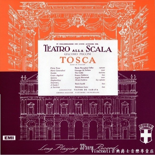 普契尼在文藝風的《波西米亞人》之後,1900 年推出這齣血腥暴力的《托絲卡》,可說是義大利寫實歌劇最淋漓盡致的代表作。故事描述美艷歌星托絲卡與畫家卡瓦拉多西相戀,卻因邪惡的警察總監史卡匹亞為了她的垂涎美色,導致三個主角最後全都斃命。儘管自首演一百多年來有無數女高音扮演過托絲卡,但沒有一位能夠像卡拉絲這般扣人心弦,即使僅透過唱片來聆賞,尤其第二幕的逼供場景,卡拉絲用歌聲傳遞出如許豐沛的情感,每一個樂音都強烈撞擊聽者的心胸,彷彿親眼目睹托絲卡的悲劇。