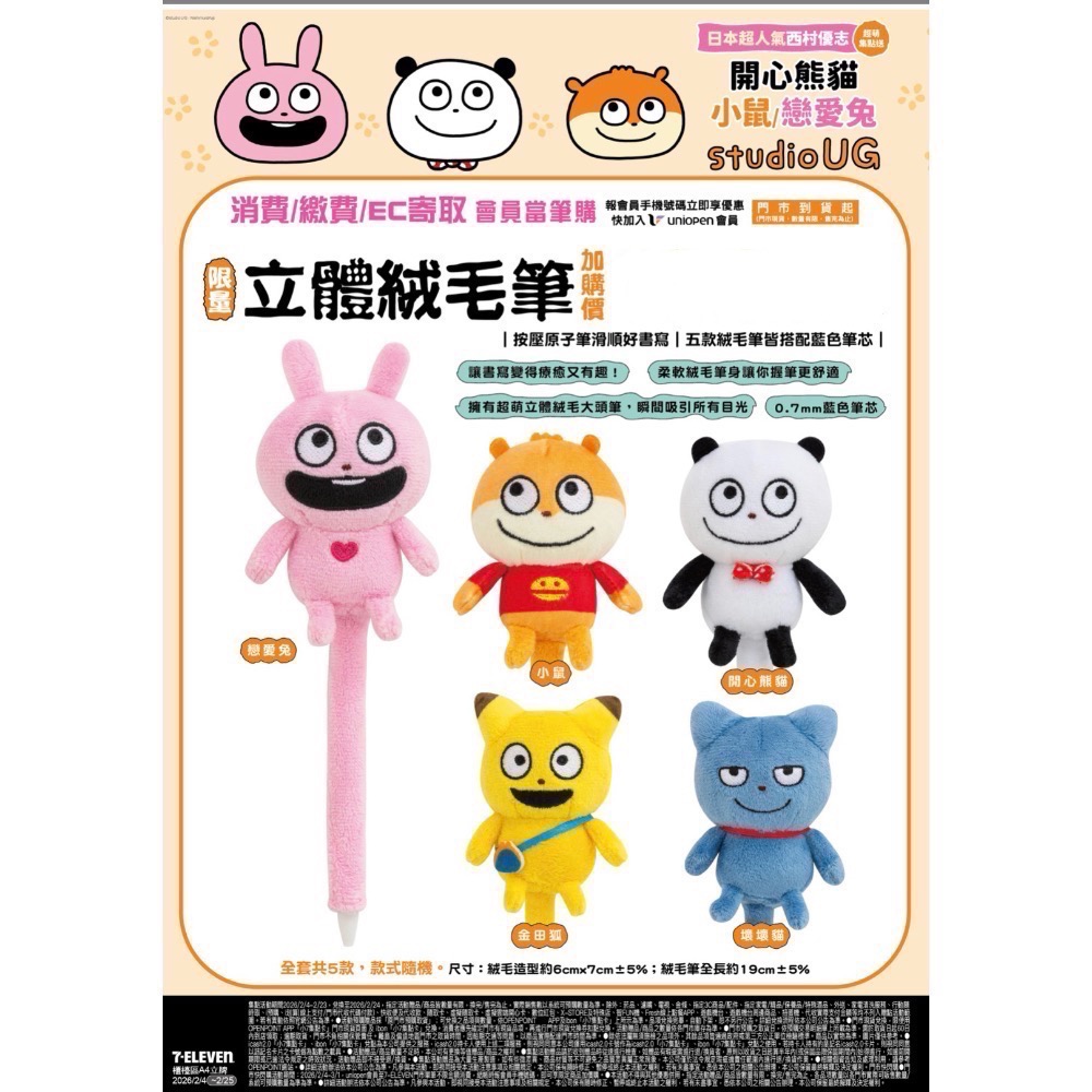 全新限量現貨 正版授權 7-11 西村優志 立體絨毛筆 開心熊貓 戀愛兔 小鼠 壞壞貓 金田狐