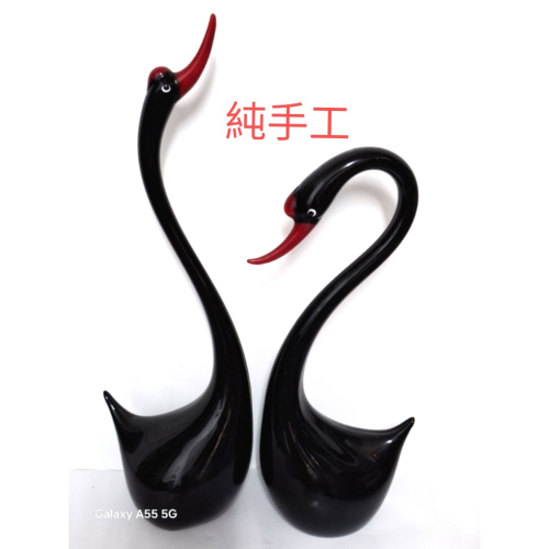 這是一對優雅的純手工製作紅嘴黑色天鵝擺飾,設計獨特,線條流暢。兩隻天鵝姿態各異,一隻高頸挺立,另一隻彎頸顧盼,形成美麗的對稱。牠們擁有鮮紅色的鳥喙,為整體增添一抹亮色。這對天鵝擺飾高度約為48公分,適合放置於店面擺飾、客廳、書房或辦公室,為您的居家空間增添藝術氣息與高雅品味、更能展現台灣30年經驗老師傅的精湛玻璃藝術創作。是送禮或自用的絕佳選擇。店家鎮店之寶。 重量:5kg/對 產地:台灣