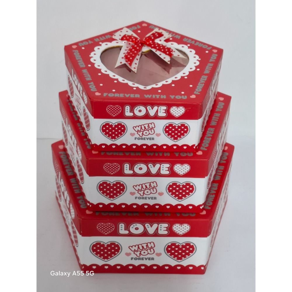 這款精美的紅色愛心禮物盒套組,包含三個尺寸漸層的六邊形禮物盒,設計獨特且充滿浪漫氣息。每個盒子都印有「LOVE WITH YOU FOREVER」字樣及愛心圖案,頂部飾有可愛的波點蝴蝶結,並有心形透明窗設計,讓禮物若隱若現。非常適合情人節、生日、週年紀念或其他特殊節日,用來包裝糖果、巧克力、飾品或小禮物,為您的心意增添一份驚喜與溫馨。