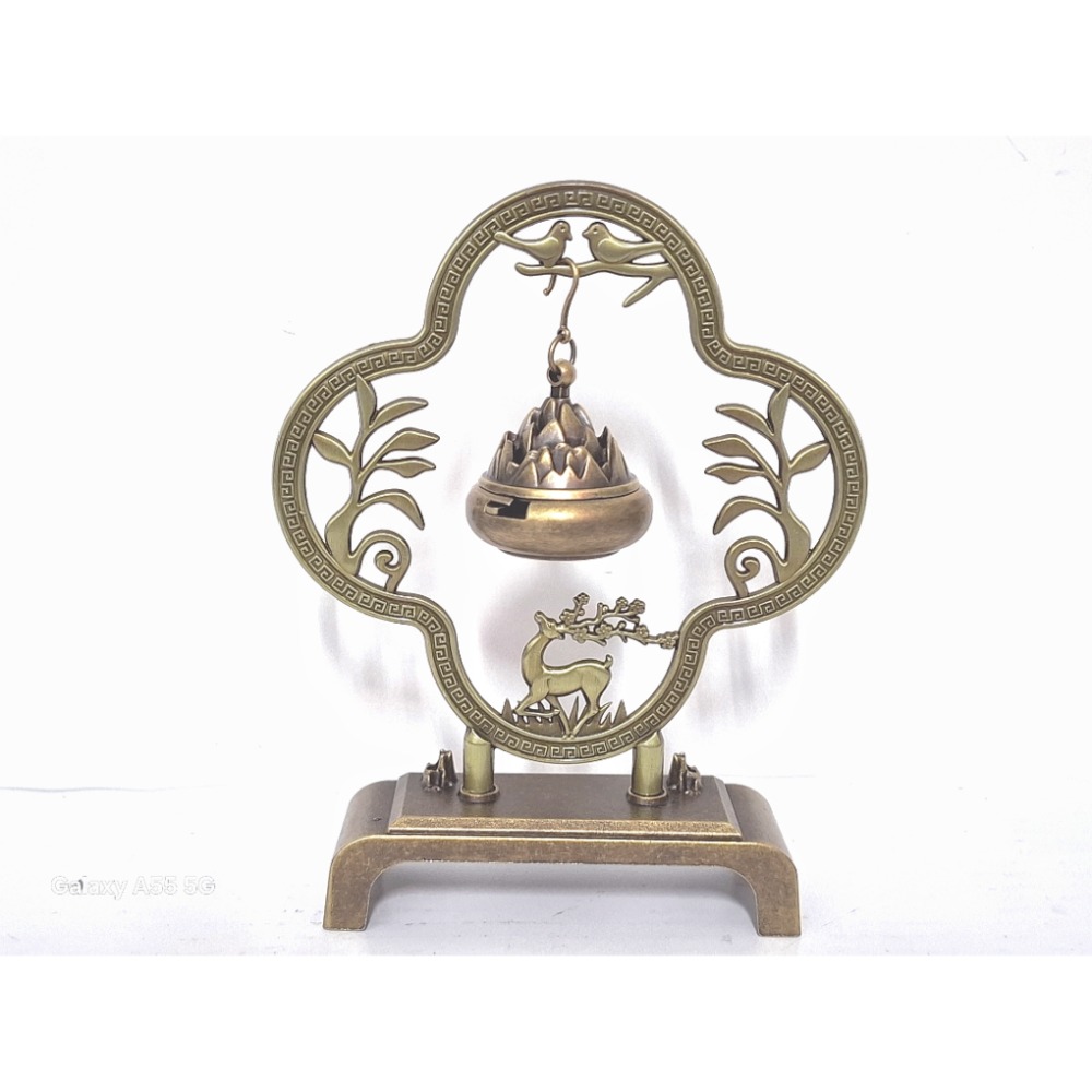 此款精緻復古銅製一鹿(路)平安香爐擺飾寓意深遠,設計獨特,以優雅的梅花鹿、靈動的飛鳥與繁茂的枝葉為主題,構成一幅生動的自然景象。香爐主體懸掛於精美的鏤空框架之中,爐蓋造型宛如山巒疊嶂,增添一份古典韻味。不僅是焚香的實用器皿,更是提升居家品味、茶道空間或辦公室氛圍的藝術擺件,亦可作為收藏品。 Size:12.5×3.2×15.7cm,/150g