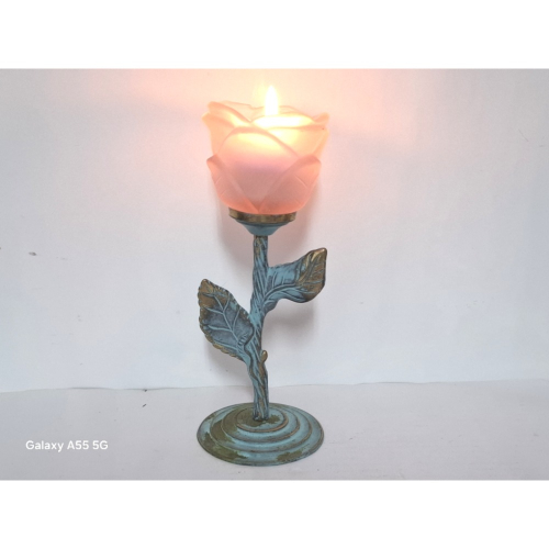 這款精緻的玫瑰造型銅製蠟燭台,結合了優雅的設計與實用功能。燭台主體以仿古金屬工藝打造,呈現獨特的青銅色澤與葉片細節。頂部搭配霧面玻璃粉紅色玫瑰花瓣造型燭杯,內含一顆點燃的蠟燭,散發溫暖光芒。尺寸約7.3x7.3x19公分,重量約260克,適合居家裝飾或營造浪漫氛圍。 產地:台灣