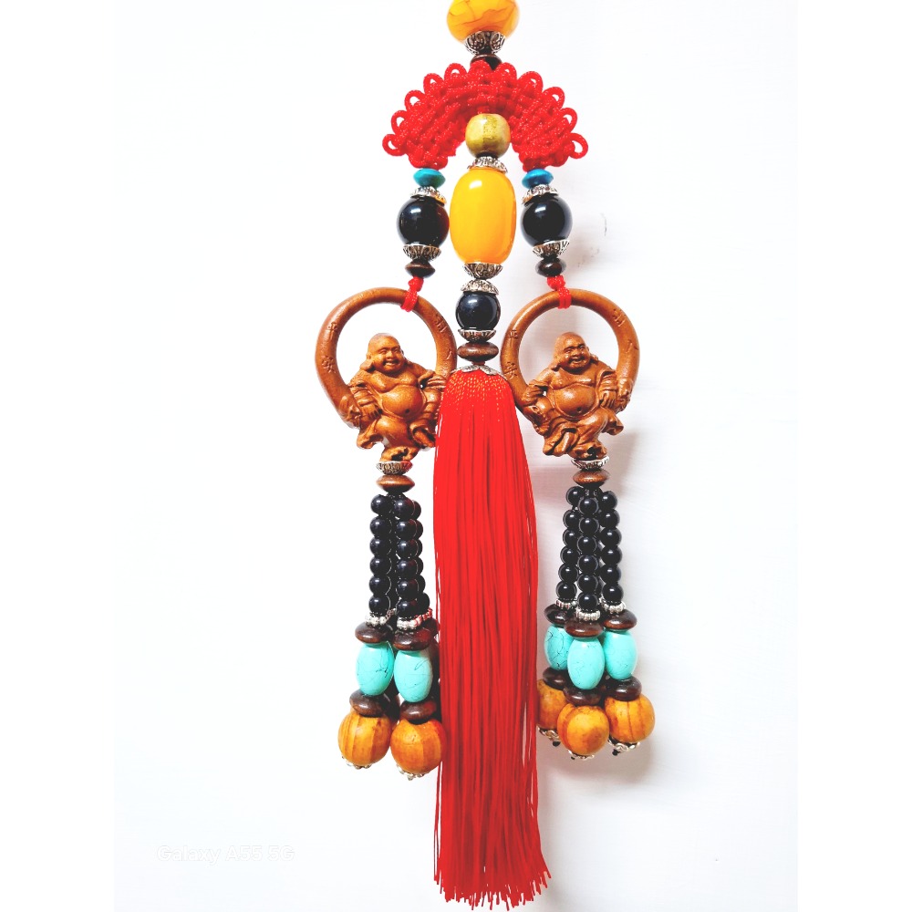 精緻手工編織,雙面彌勒佛木雕,搭配流蘇與各色珠飾,寓意招財納福。