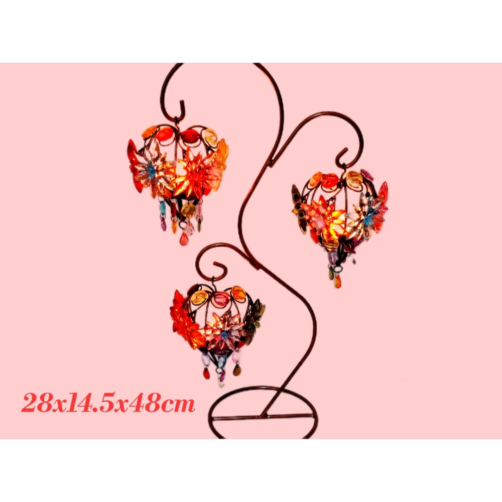 燭臺僅適用傳統蠟燭,當燭火點燃時,溫暖的火焰會透過三個心形燈罩上鑲嵌的彩色琉璃串珠,將光線折射成如夢似幻的繽紛花火。這份光影魔術,能瞬間創造出極致浪漫、溫馨的氛圍,是營造節日、紀念日或靜謐夜晚的必備單品。