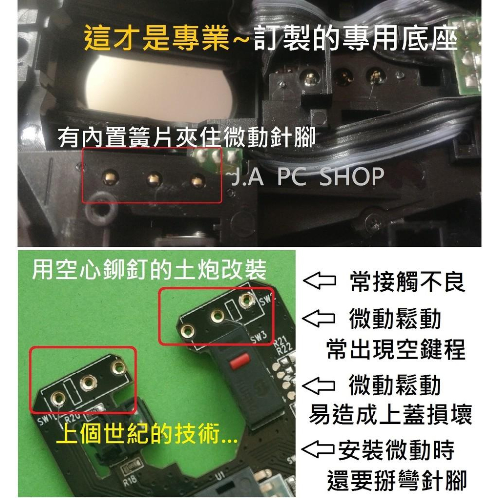 (改裝) 有線 / 無線 滑鼠 改裝 崁入式可拔插底座 GPW間隙調整 微動開關 更換 ~讓您更換微動更easy,隨時想換就換~ ※ 非鉚釘的土炮改裝,使用訂製專用的底座有簧片夾住微動針腳。 ※ 按鍵微動是消耗品一段時間就要請人換一次,花錢又浪費時間。 ※ 按鍵微動的手感不滿意又要花錢請人換一次,花錢又浪費時間。 ※ 滾輪上下亂跳動或對滾輪滾動的手感不滿意,請人換一次花錢又浪費時間。 ※ 每種滑鼠拆解難異度有所不同,請先於蝦皮聊聊中洽詢價格。 ※ 可指定自己要的型號微動。 ※ ※ 改裝前注意事項 ※ ※ 改裝會贈送一支銼刀。 1.若是有使用少數特殊規格的微動(例如:彎腳的請夾直(例:歐姆龍D2F-01F-T 、 HONEYWELL MICRO UX10C ), 倒勾的請把倒勾處剪掉(例:凱華靜音微動),特粗針腳的(例:Cherry微動)把針腳磨細一點再插入較不會損壞底座)。 若使用特細針腳太鬆的話(或是之前有插到特粗針腳造成的),可從PCB下方將彈簧片夾緊就可以了(彈簧片為可調式)。 2.使用上有任何問題我們都會協助處理到好請不用擔心,但若是連基本的拆裝都不會還是不建議您改裝或購買使用這類型的商品,因為即使是市售那款您也無法直接插入歐姆龍D2F-01F-T微動及HONEYWELL MICRO UX10C微動(會造成底座損壞且判定為人為不保固的)。 ~台南永康可自送取件~ ※改裝及送修流程: 1.每款滑鼠拆裝難易度不同所以工資也不一樣,請洽詢 J.A PC SHOP 確認改裝項目及費用。 2.可以約定時間自己送過來。 3.可使用郵局包裹寄送或是超商店到店寄送服務。 4.維修完成後會貼上專屬下標連結給您下標,再依照蝦皮金流付款方式付費即可(可超商取貨付款)。