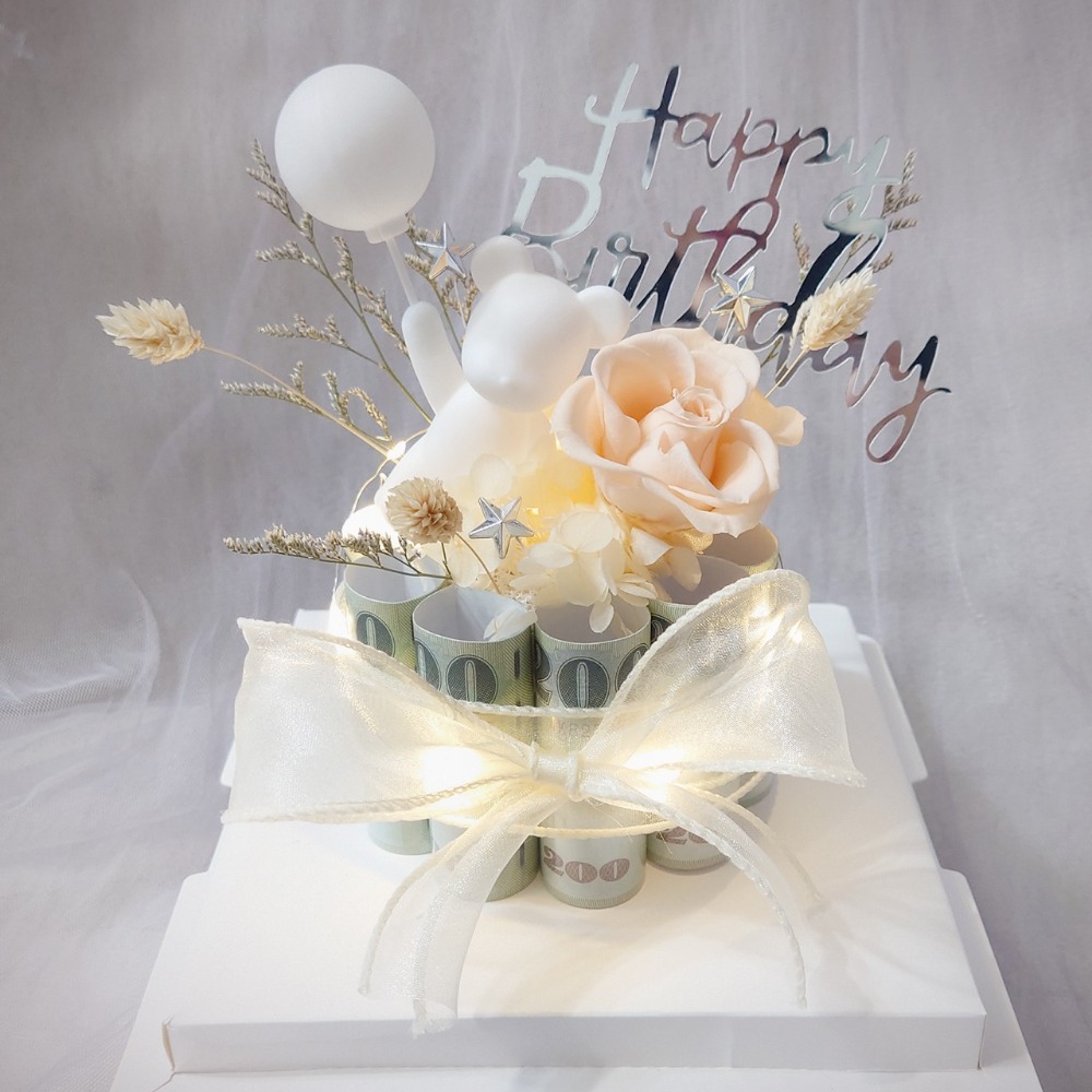 【KIRA與花花藝】氣球熊迷你永生花鈔票蛋糕-香檳橘/可放10張/ 有錢花 永生花 乾燥花 生日 禮物 錢蛋糕 父親節