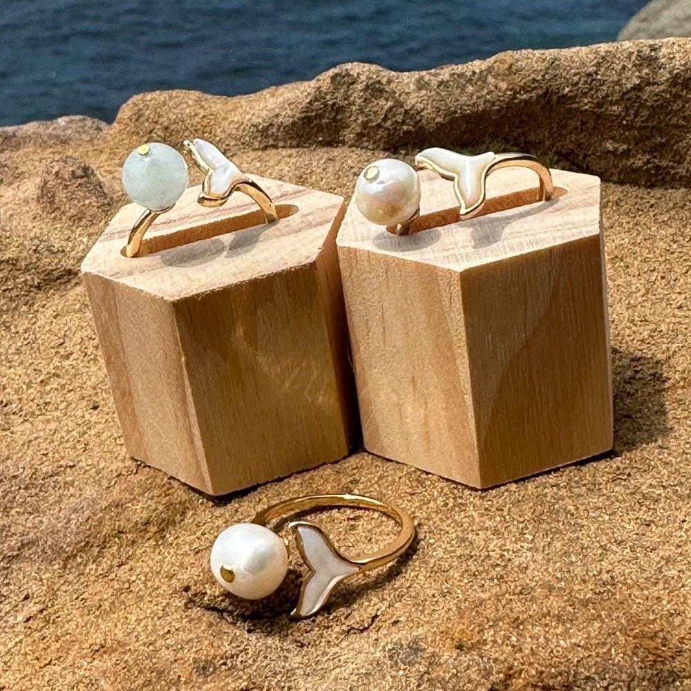 珍珠海藍寶珠貝魚尾戒指。將優雅的珍珠、神秘的海藍寶珠和生動的珠貝魚尾形象完美結合,象徵在大海自由優雅游遊,為您的手指帶來獨特的光彩。珍珠的光澤和細膩紋理展現出優雅的氣質。珍珠巧妙地鑲嵌在魚尾旁散發出璀璨光芒,魚尾造型的設計讓戒指更具獨特性和生動感,如同一尾在海洋中自由遨遊的優雅美人魚尾。