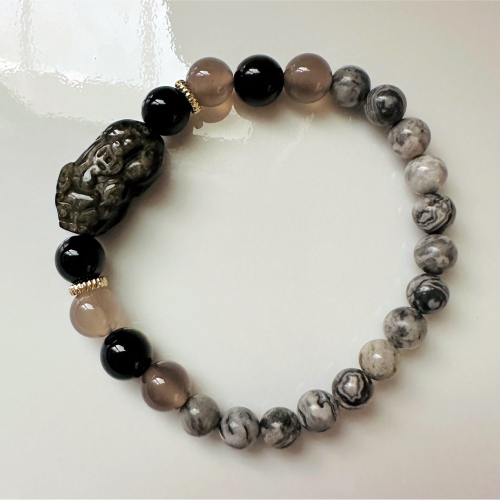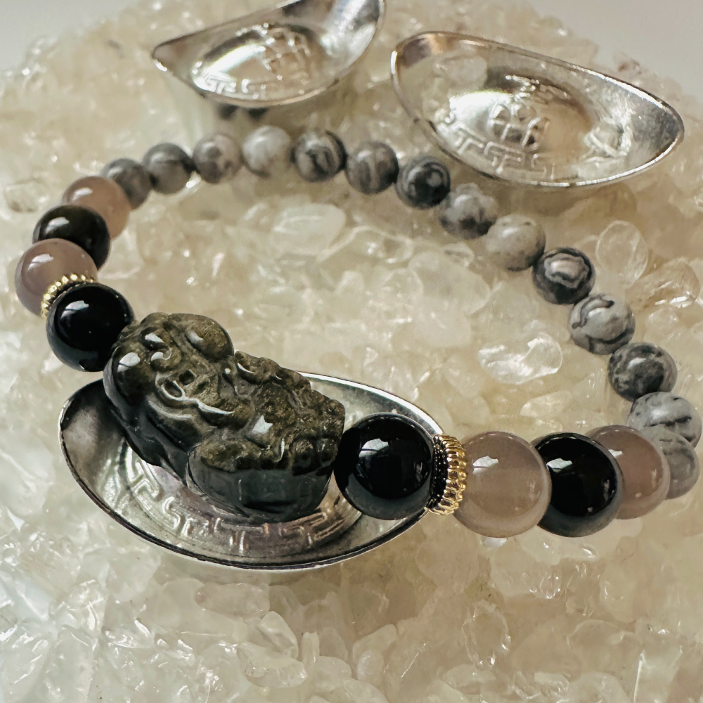 貔貅據說具有趨吉避凶、開運納財神奇效果。它的形象狀似獅子,為佩戴者帶來平安和好運。結合黑曜石的能量,更能夠激發出貔貅的潛在力量,吸引豐盛的財富和事業成功。