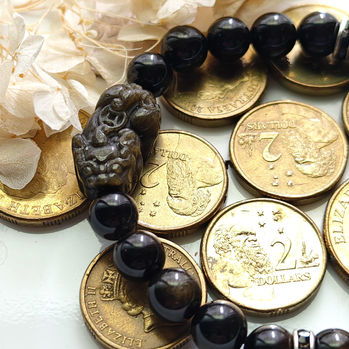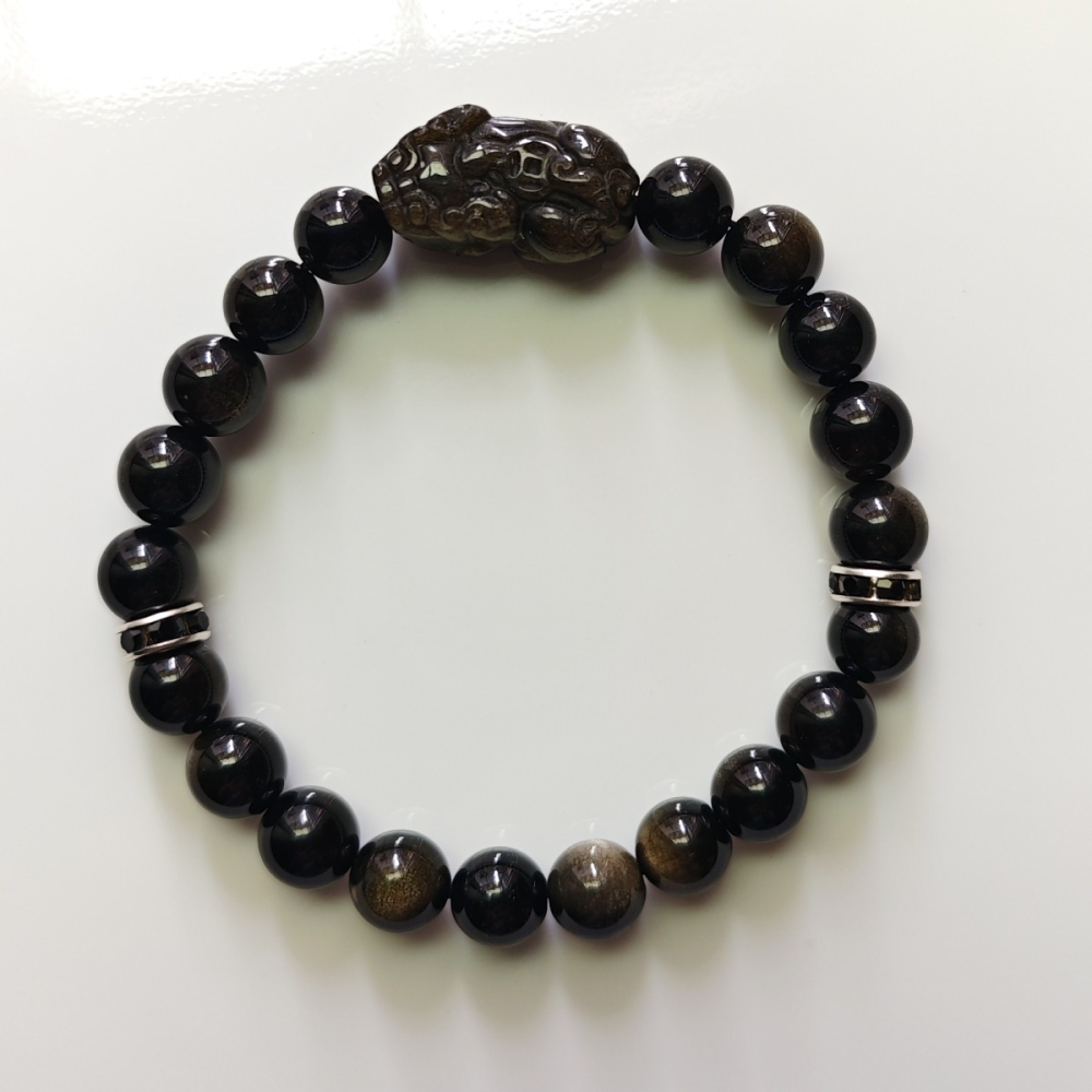貔貅具有趨吉避凶、開運納財神奇效果。只進不出的吸財能力,使貔貅一直是要吸納財富最好的神獸,它的形象狀似獅子,為佩戴者帶來平安和好運。結合黑曜石的能量,更能夠激發出貔貅的潛在力量,吸引豐盛的財富和事業成功。