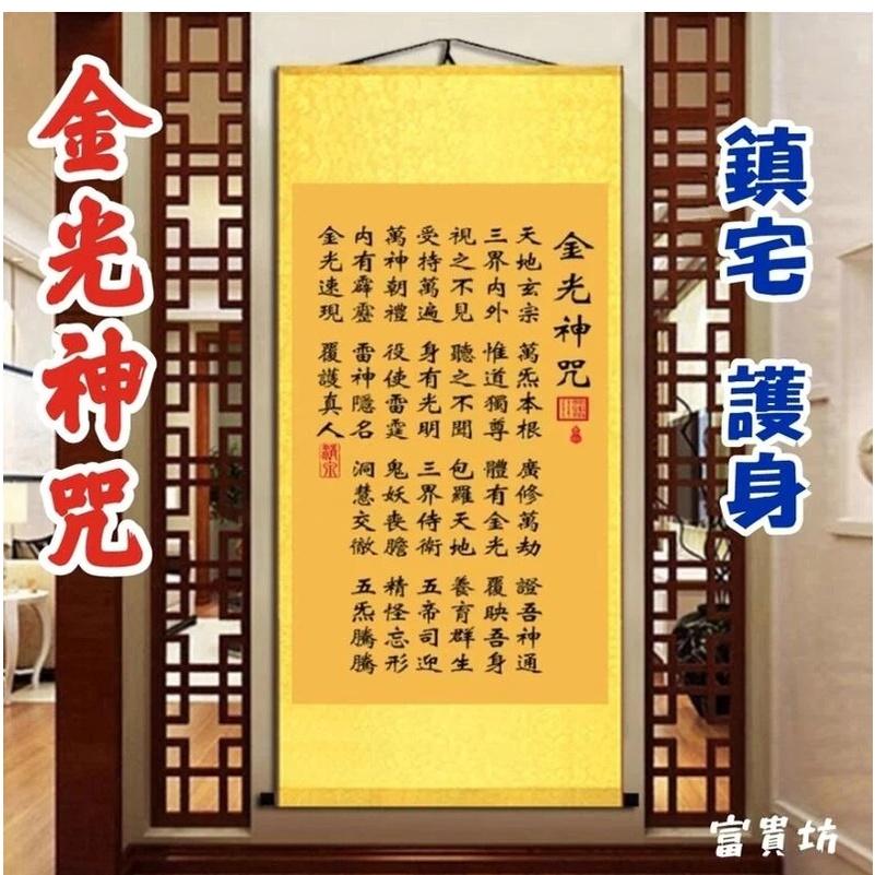 『富貴坊』【開光】金光神咒絲綢捲軸掛畫,金光神咒,金光咒,經文畫,掛畫,鎮宅護身,道教法術咒語K01 名稱:金光神咒絲綢捲軸掛畫 【贈品】 開光證書。 【意義】 1、金光神咒是道教的基本神咒之一,有鎮邪護身的功能,故被佛教高僧、風水明師高手採用來為福主用事,保福主人宅平安,妖邪伏法,人際順利平安。 2、金光神咒: 天地玄宗,萬炁本根,廣修浩劫,證吾神通。 三界內外,唯道獨尊。體有金光,覆映吾身。 視之不見,聽之不聞。包羅天地,養育群生。 誦持萬遍,身有光明。三界侍衛,五帝司迎。 萬神朝禮,役使雷霆。鬼妖喪膽,精怪亡形。 內有霹靂,雷神隱名。洞慧交徹,五炁騰騰。 金光速現,覆護吾身,玄氣聚身,急急如律令! 最簡心咒:玄氣聚身,急急如律令。 【安置】 置於可隨時默唸觀看的場合,如客廳、臥室、書房、辦公室、店面等。 【尺寸】 約寬30cm,長80cm。 【材質】 絲綢面料。實木軸頭。