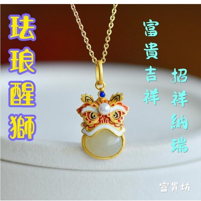 『富貴坊』【開光】珐琅玉石醒獅項鏈,醒獅,獅子,護身符,招財納福,行車平安,玉石吊墜K17