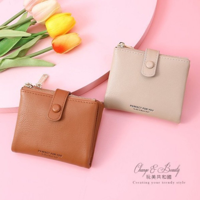 (限時199免運)現貨👍韓版錢包熱賣大容量雙拉鍊搭扣奶茶色女皮夾短夾女包>玩美共和國>
