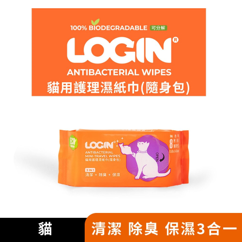 【福爾摩沙寵物精品】澳洲LOGIN 洛格 3合一除臭抑菌護理濕紙巾 隨身包(單包/8抽/貓用)