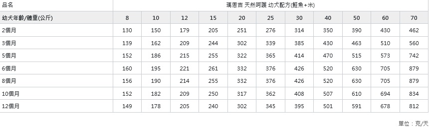 請依照包裝圖表幼犬體重、年齡與運動量進行餵食,建議分3餐食用,確保提供新鮮乾淨的水。如有特別需要可諮詢獸醫師調整用量。
