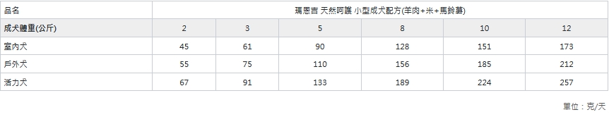 請依照包裝圖表成犬體重、年齡與運動量進行餵食,建議分2餐食用,確保提供新鮮乾淨的水。如有特別需要可諮詢獸醫師調整用量。