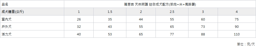 請依照包裝圖表成犬體重、年齡與運動量進行餵食,建議分2餐食用,確保提供新鮮乾淨的水。如有特別需要可諮詢獸醫師調整用量。
