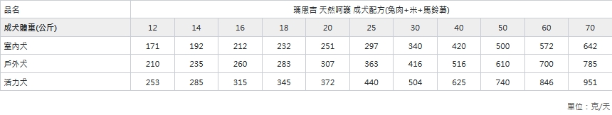 請依照包裝圖表成犬體重、年齡與運動量進行餵食,建議分2餐食用,確保提供新鮮乾淨的水,如有特別需要可諮詢獸醫師調整用量。