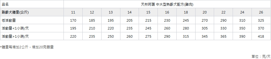 請依照包裝圖表熟齡犬體重、年齡與運動量進行餵食,建議分2餐食用,確保提供新鮮乾淨的水。如有特別需要可諮詢獸醫師調整用量。