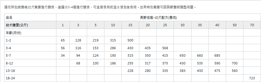 請依照包裝圖表幼犬需要進行餵食,建議分3-4餐進行餵食,可直接食用或溫水浸泡後食用。如有特別需要可諮詢獸醫師調整用量。