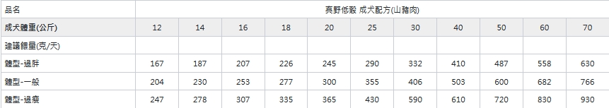 每日餵食量請見餵食建議表,可分為二餐 。飼主請依據寵物活動量與體型調整餵食量 。更換新食物的轉換過渡期至少1週,餵食過程請隨時提供新鮮與乾淨的水 。
