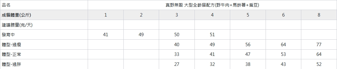 每日餵食量請見餵食建議表,可分為二餐 。飼主請依據寵物活動量與體型調整餵食量 。更換新食物的轉換過渡期至少1週,餵食過程請隨時提供新鮮與乾淨的水 。