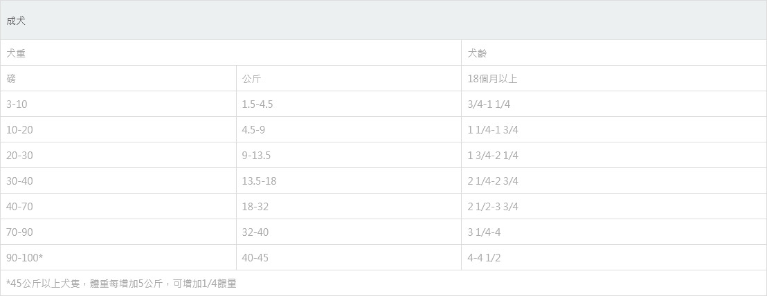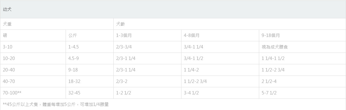 此表僅用作初步建議,請根據犬年齡、品種、環境、活動和身體狀況調整餵食量,以保持理想體重,避免過量餵食。隨時為您的寵物提供新鮮、乾淨的飲用水。