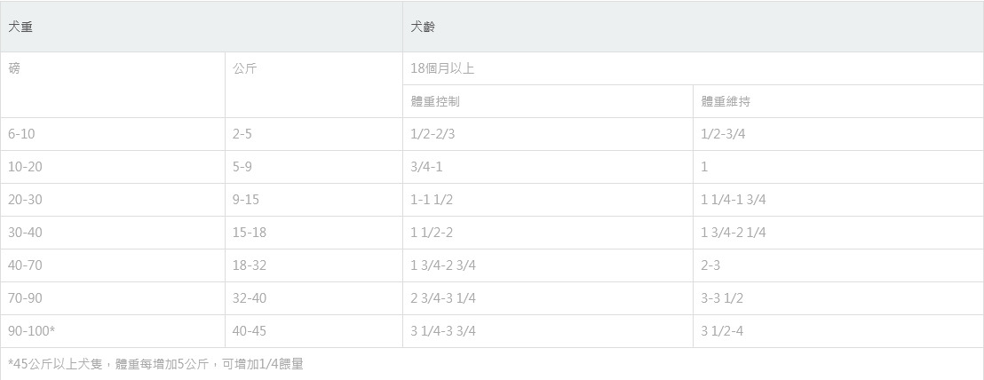 成犬每日可餵食一次或兩次。若每日餵食超過兩杯,建議在一天的不同時間餵兩次等量的食物。 此表僅用作初步建議,請根據犬年齡、品種、環境、活動和身體狀況調整餵食量,以保持理想體重,避免過量餵食。隨時為您的寵物提供新鮮、乾淨的飲用水。