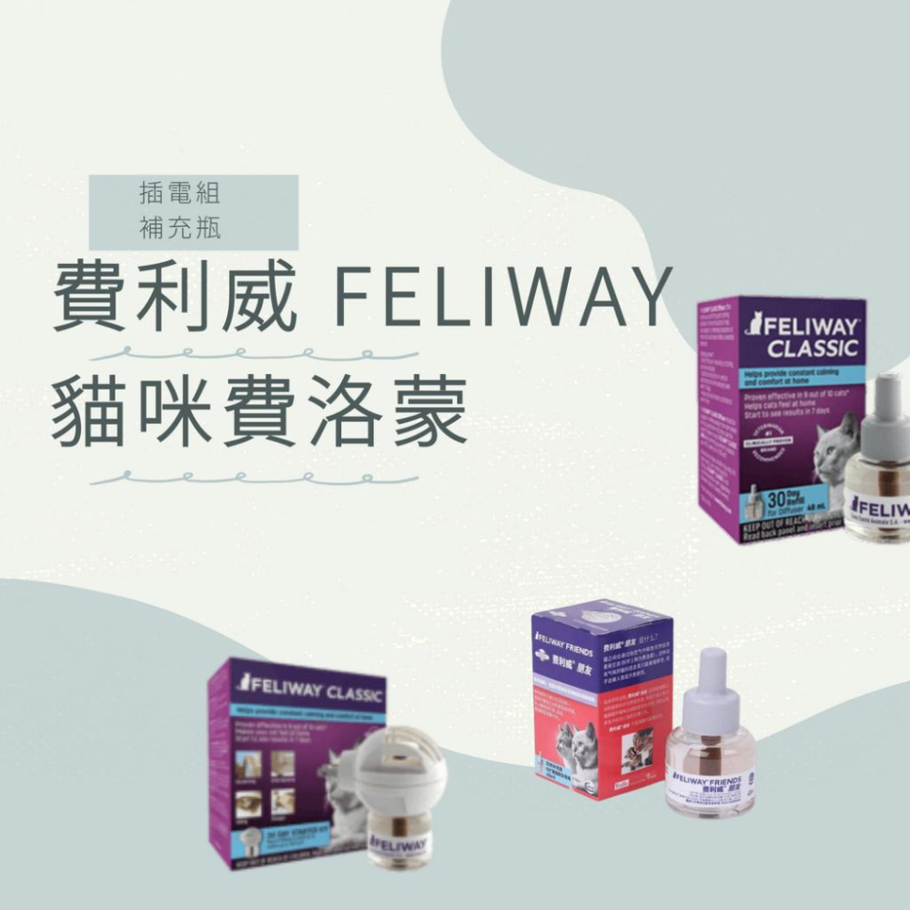 穩定情緒:貓咪有亂咬打架不安等狀況時可幫助穩定情緒。 改善行為:能改善亂抓傢俱、亂噴尿等行為。 放鬆情敘:剛搬新家或加入新成員時可幫助解除不安。 費洛貓 FELIWAY的效果及作用:環境改變或貓咪領域受到侵犯常常是貓咪不良行為的導火線,費洛貓FELIWAY藉由釋放貓咪熟悉的費洛蒙,有效阻止不良行為的產生及減少貓咪情緒反應。 幫助貓咪及早適應環境及穩定情緒。改善貓咪因壓力產生的噴尿行為新家、新裝潢或是裝修、新的傢俱或是物品、新客人或是新同居室友。 改善多貓家庭或中途之家的貓咪相處問題飼養超過2隻以上貓咪的家庭(或中途之家),貓咪經常因緊張或是其貓咪領域被其他貓咪打擾而有情緒不良的行為表現,如:噴尿標記,磨爪行為,不友善及侵略攻擊行為等。 改善貓咪亂磨爪破壞家俱有些貓咪因活動領域被其他貓咪侵犯或是拓展新的領域時,會利用磨爪動作來展示自身不安或是建立領地範圍。 多貓好朋友-帮助生活在同一家庭中猫咪之間的緊張和衝突,防止猫咪間互相追打,圍堵,怒視對方等表現。 FELIWAY MULTICAT多貓好朋友插電組、補充瓶 是合成的貓咪安撫費洛蒙 具有動物特異性,只有貓咪能夠偵測到它的存在 可以協助多隻貓咪在一個屋內和諧生活,減少彼此之間的衝突頻率和緊張程度 適合幼齡到老年各種年齡的貓咪使用 FELIWAY CLASSIC插電組、噴劑、補充瓶 預防或終止尿液標記及亂抓家具 減少緊迫及降低貓咪間的衝突,維持貓群和諧的氣氛 安撫貓咪的不穩定情緒 ▸搬家、新裝潢或是家具移動 ▸新成員(人或伴侶動物加入) ▸運輸或旅行 [使用方法] 將本品插入房間內的插座,就會開始揮發,其味道只有貓咪聞得到,可持續使用24小時 一瓶大約可用四周,第7天成效立現;28天,成功率高達95%