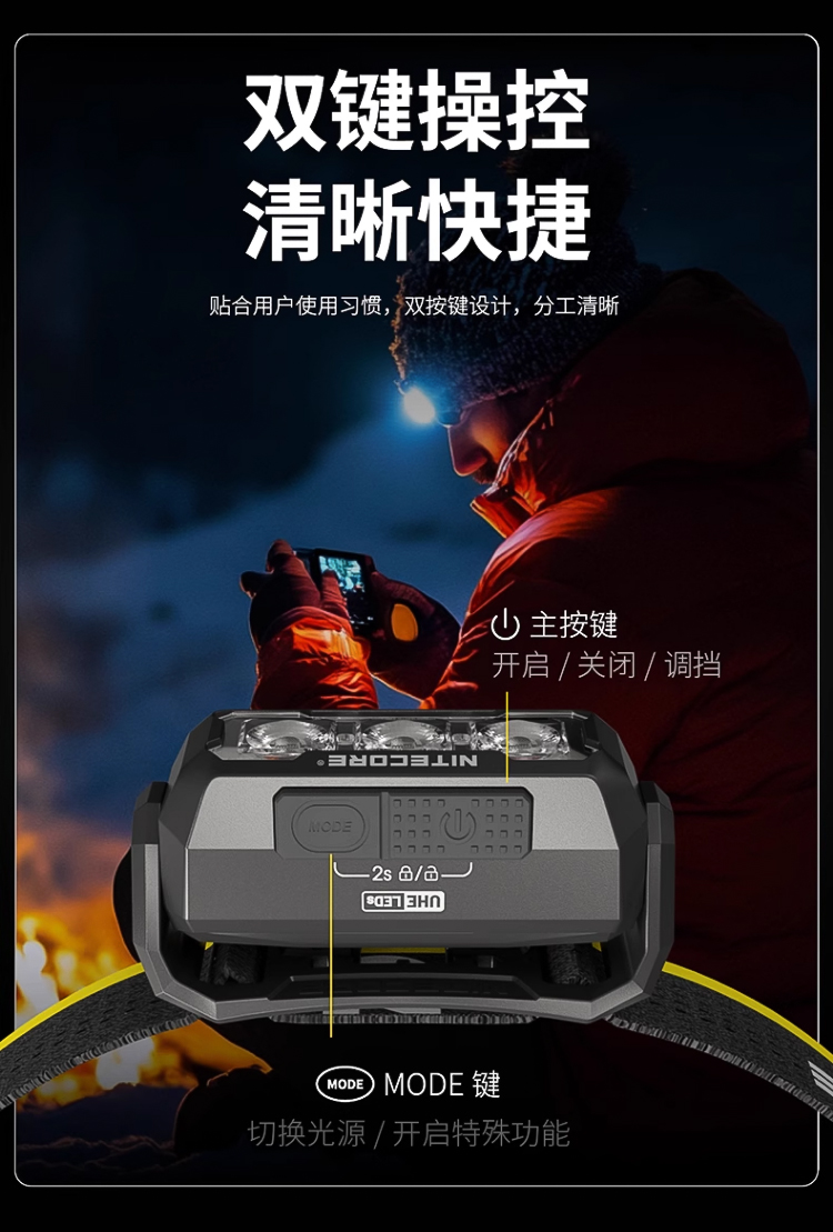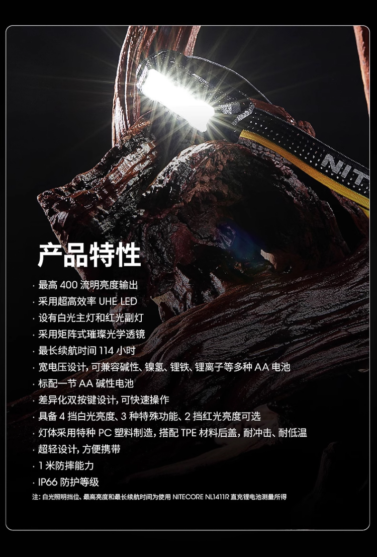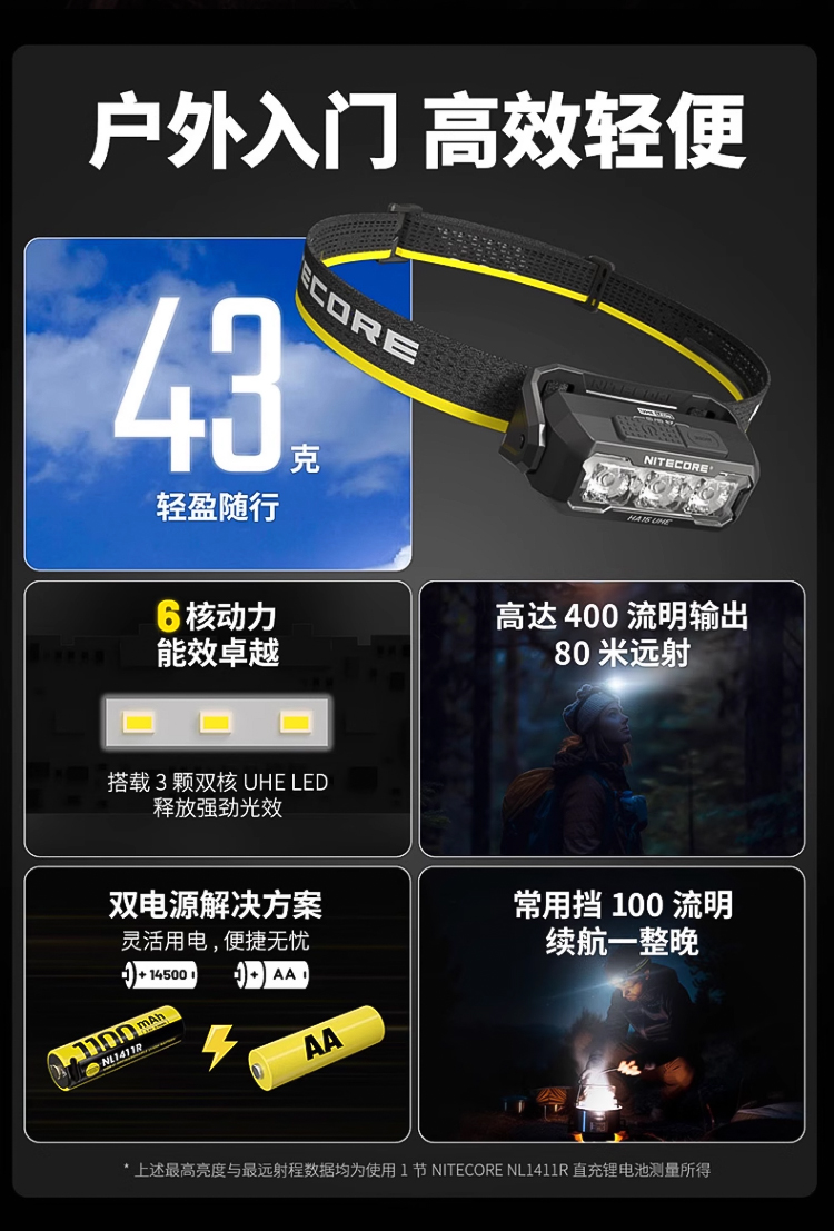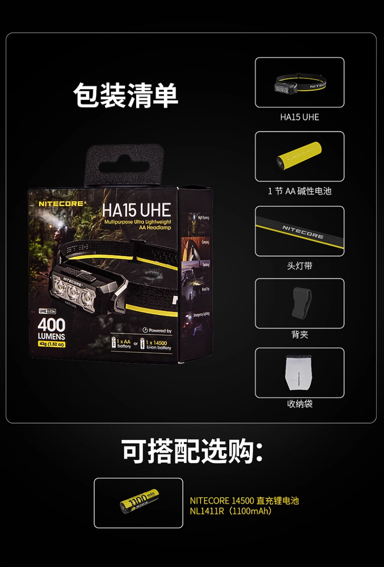 HA15 UHE保持了HA系列的突出優勢,採用了雙電源解決方案,兼容多種AA電池與NITECORE NL1411R 14500直充鋰電池,用電無憂,戶外更省心。