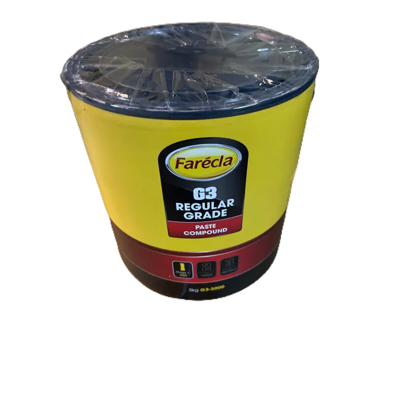FARECLA G3 英國進口 G3 汽車美容用 粗蠟 三公斤裝 另售225g分裝瓶 産品說明: G3是一種多用途廣泛使用的最理想產品,其高濃度、高切割力設計,可以在一道工序中快速去除砂紙痕,同時達到鏡面效果。 功能: ●快速修複漆膜因操作失誤引起的缺陷 ●去除P1200目數以上砂紙痕 ●除去塵粒、流挂、過量噴塗及橘皮紋等 ●可修複被氧化的陳舊漆膜,恢複漆膜高光澤度 使用說明: 適合手磨和機磨 手磨:根據拋光面積,取適量G3快臘塗于漆膜表面,用抹臘布以前後或打圈的打磨方法,在漆膜表面均勻打磨,直到砂紙痕去除為止。 機磨:配合海棉輪配套使用,拋光機的適當速度爲2000轉/分鐘以下,然後把適量G3快臘塗于漆膜表面,抹勻臘後啟動拋光機,保持上下交叉的方式在漆膜表面研磨,要控制好漆膜表面的溫度,必要時可以噴灑適量清水于漆膜表面,直到砂紙痕去除為止,完成後用抹臘布抹去多餘的臘,即可達到完美效果。 能去除漆面細塵粒、輕微白化、烤漆後橘子皮、柚紋肌、垂流、砂紙痕、漆面失光水斑等功能,可使漆面光澤如新。亦可處理金油表面小刮傷或小碎石顆粒 泊油噴染等等,烤漆後、噴完金油隔日即可打腊。 如金油產生落塵、粉塵、橘皮、垂流等問題,可使用約1500番水砂紙做表面研磨後再使用G3打腊即可恢復亮麗如新。 @@@便利商店取貨只限一桶@@@
