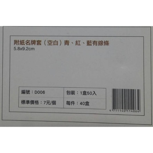 珍奇 D006 附紙名牌套(空白) 青、紅、藍有線條