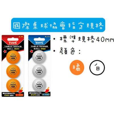 SUCCESS 成功 一星桌球/3入 材質:賽璐珞 規格40mm 顏色:4401A白/4401橘 市價:40元/卡 SUCCESS 成功 一星桌球/6入 材質:賽璐珞 規格40mm 顏色:4402A白/4402橘 市價:75元/卡 S3002 二星桌球6入 (橘) ◎規格: 40mm ◎重量: 2.7g 材質 : ABS樹酯