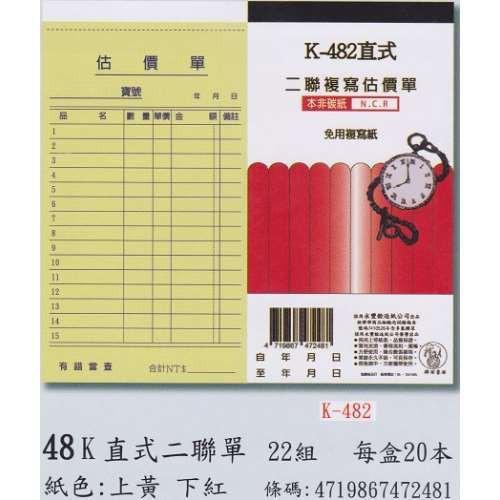 象球牌 K-482 直式二聯複寫估價單 48K直式二聯單 單本 (22組)