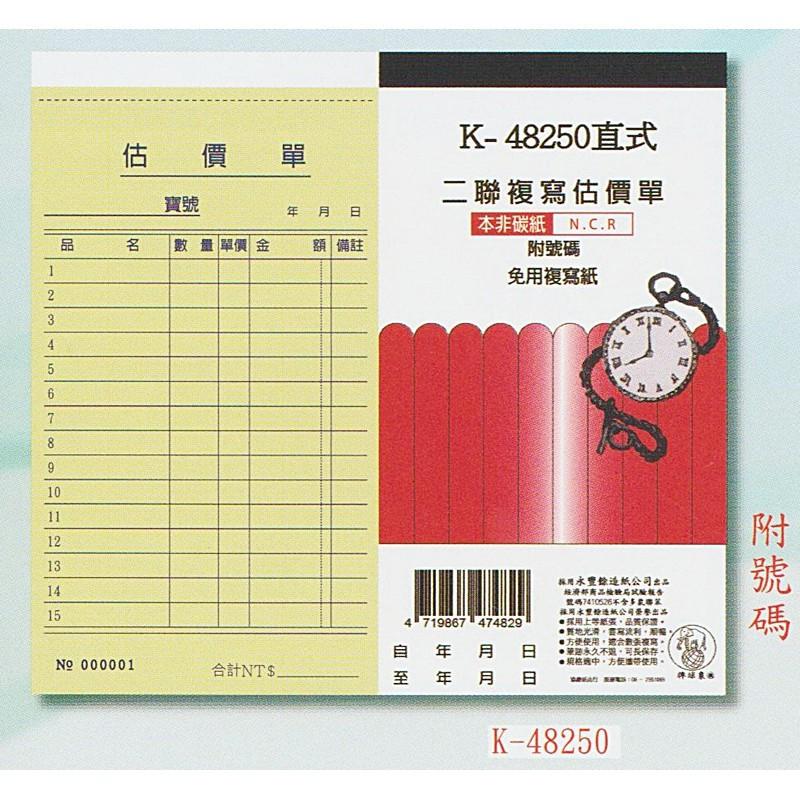 象球牌 K-48250 直式二聯複寫餐飲單 / 直式二聯複寫請款單 / 直式 二聯複寫估價單 皆附號碼 (20本組)