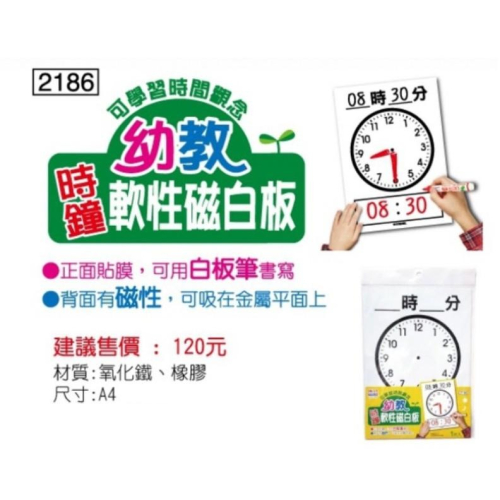 成功 2186 幼教時鐘磁性軟白板 (可學習時間觀念) - 正面貼膜,可用白板筆書寫 - 背面有磁性,可吸在金屬平面上 - 材質 : 氧化鐵、橡膠 - 尺寸: A4 / 單片入 2187 幼教習字軟性磁白板 (學習國字注音) - 正面貼膜,可用白板筆書寫 - 背面有磁性,可吸在金屬平面上 - 材質 : 氧化鐵、橡膠 - 尺寸: 15X15cm / 1片入