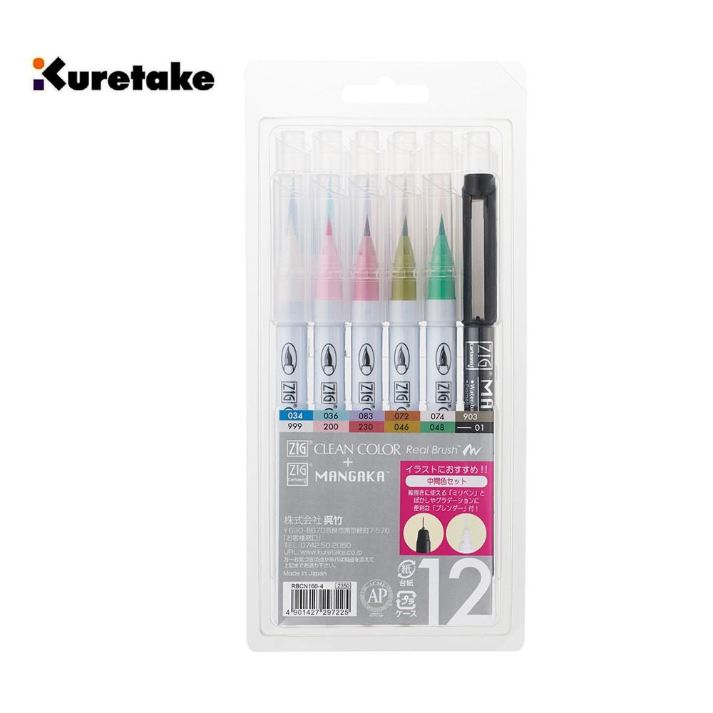 【Kuretake 日本吳竹】ZIG 彩繪毛筆+代針筆 十二色套組 中性色系 (RBCN160-4)