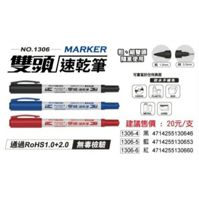 粗細雙頭,任意使用。 粗頭:1.0mm /細頭:0.5mm 可書寫於任何表面(CD、塑膠、金屬、紙箱、信用卡卡片),防水不掉色。 共有:紅、藍、黑三色。