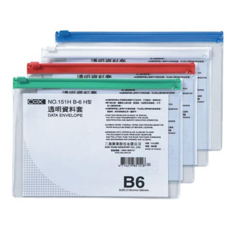 COX三燕 NO.151H B6 橫式透明資料套 資料袋 資料夾 收納袋 拉鍊袋 防水防塵 夾鏈袋 12入