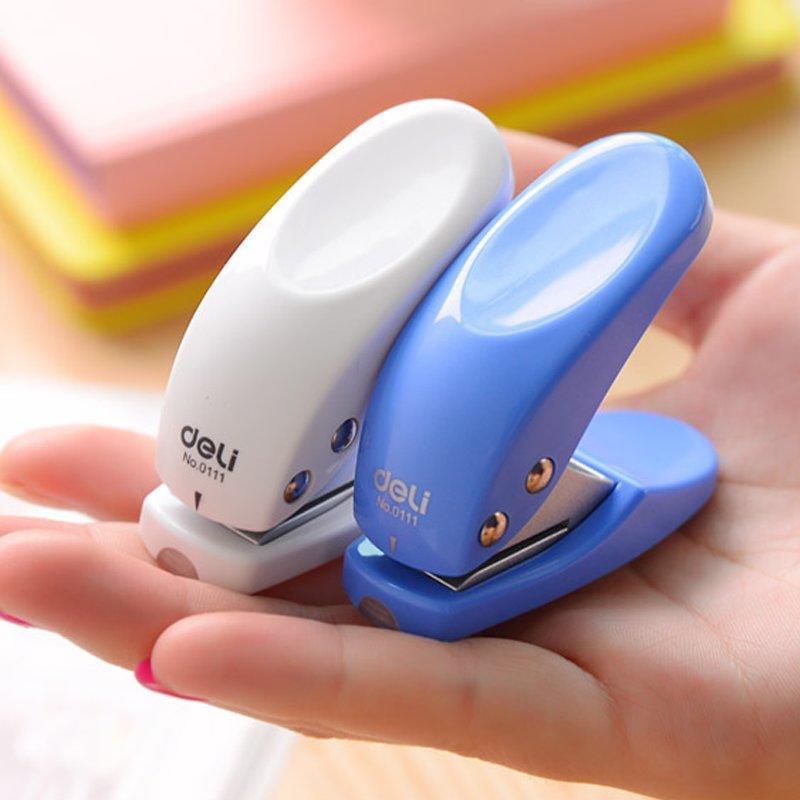 得力0111單孔打洞器 材質:塑料+金屬 尺寸:60x55mm,打孔直徑6mm 顏色:藍、白 特色:底部有紙屑盒打開即可清理,入紙深度12mm,可壓厚度為10張,流線型外觀,小巧實用,辦公時尚