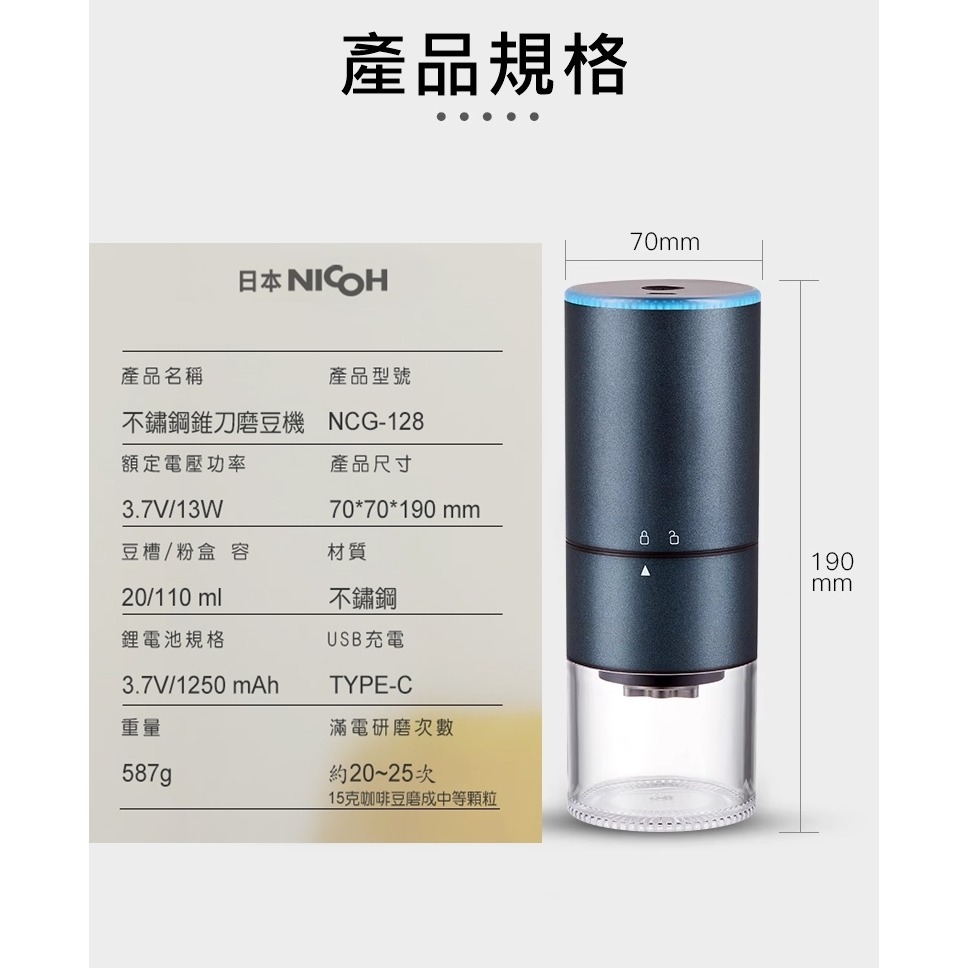 ※滿電研磨次數(15克咖啡豆磨成中等顆粒)約20-25次
