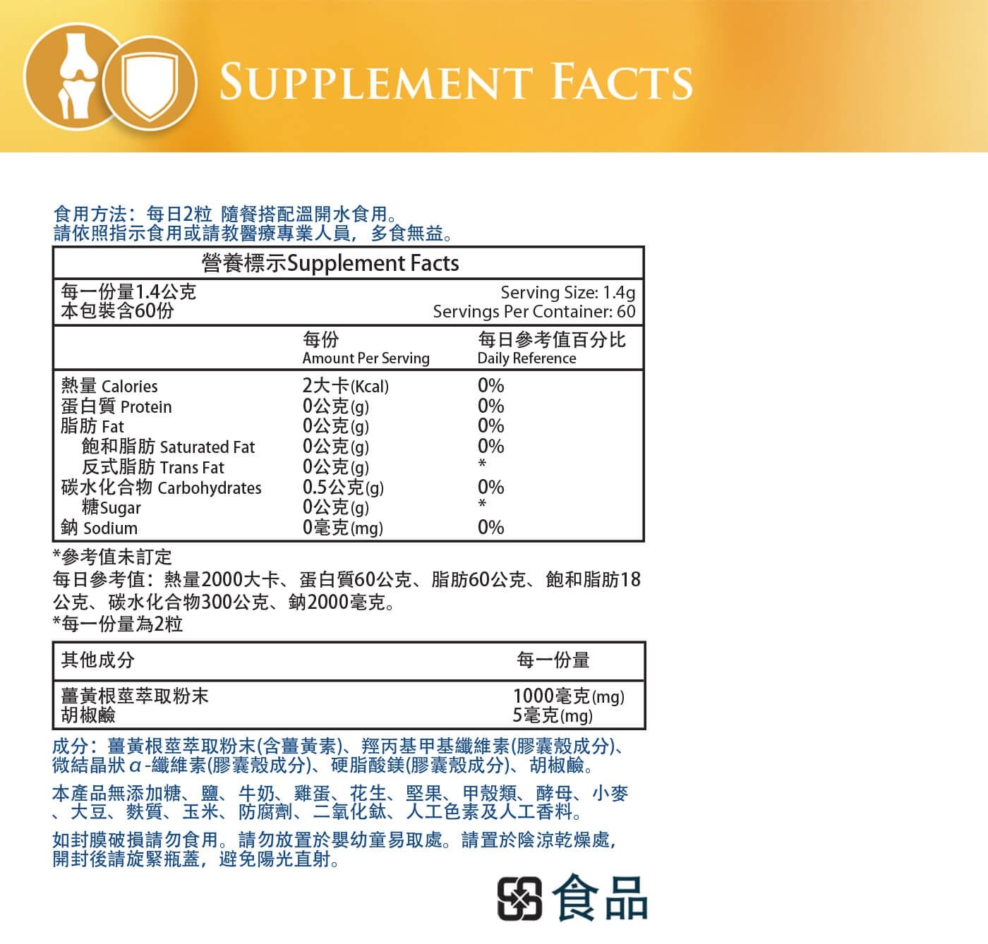 - 每一份量(2粒)添加薑黃根莖萃取粉末1,000毫克(含薑黃素Curcumin C3 Complex)、胡椒鹼 5毫克