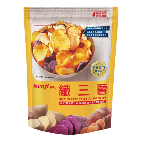 • 內含三種地瓜脆片:台農57號黃地瓜、台農66號橘地瓜、台農73號紫地瓜