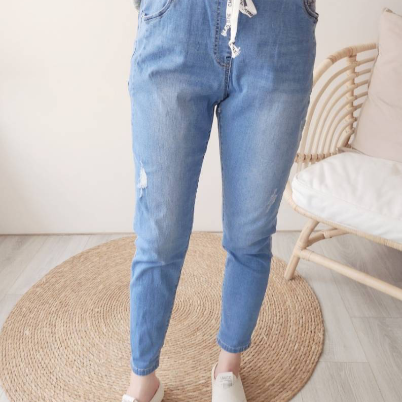 💫修身顯瘦腰圍超彈力💫抽繩款微水刷白哈倫褲 休閒褲