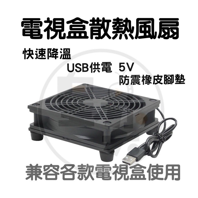 市售電視盒皆無散熱風扇,導致機器設備在不同環境下會產生過高的工作溫度,造成熱當機情況,此散熱風扇是USB接口可直上電視盒的USB孔座,將電視盒置放於風扇上方即可將工作溫度降低,防止電子零件晶片過熱導致壽命縮短、熱當機等情況發生,上面防護蓋、下方防震塑膠腳,全面防護措施