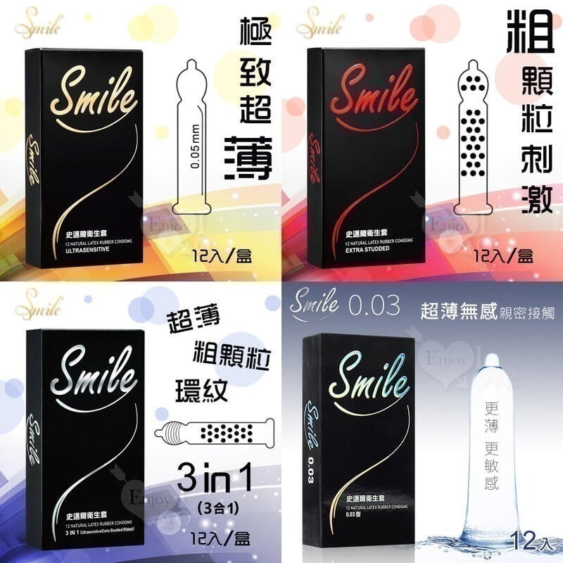 每個「Smile」乃針對使用上之安全設計,日商技術合作,採用純天然橡膠製成之乳膠,每一片衛生套包含超薄、顆粒及環狀螺紋3種特色。