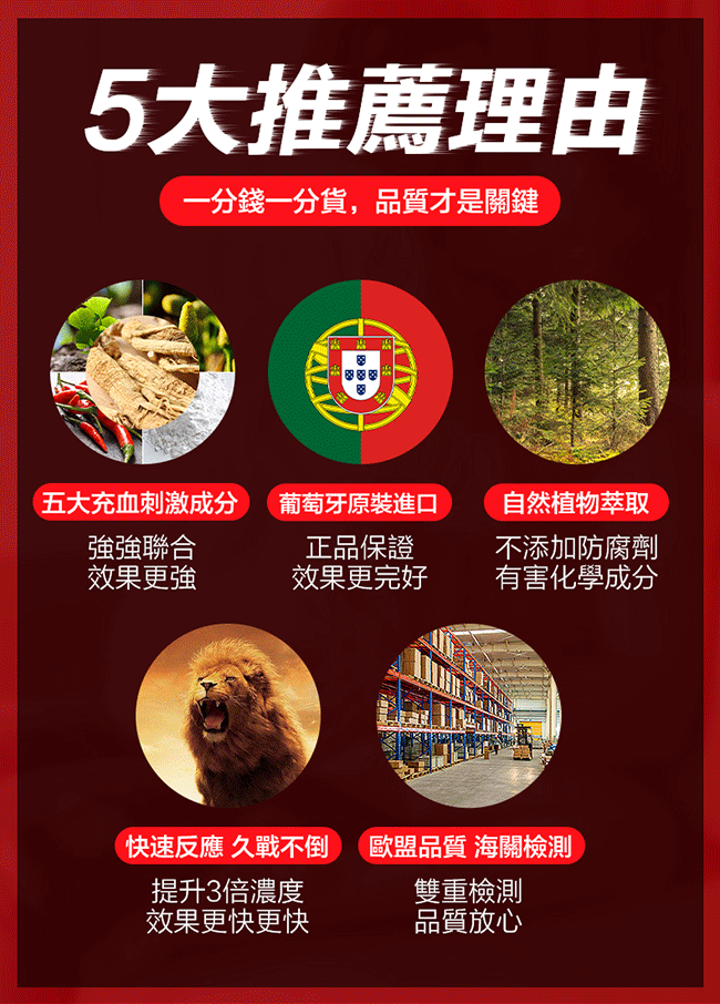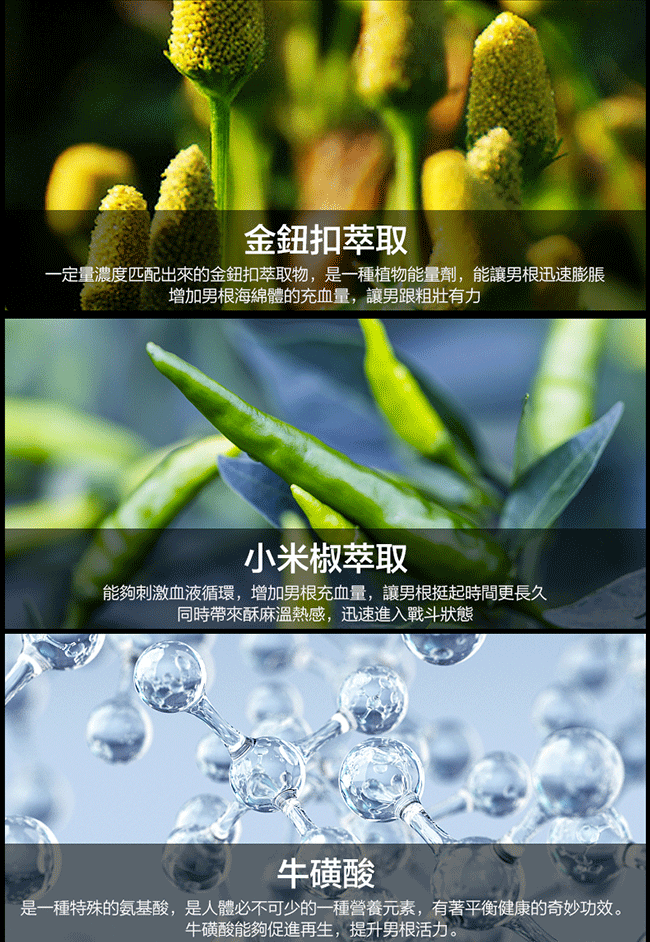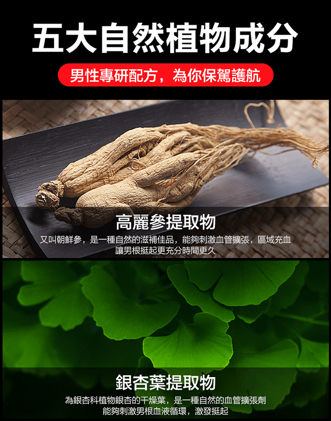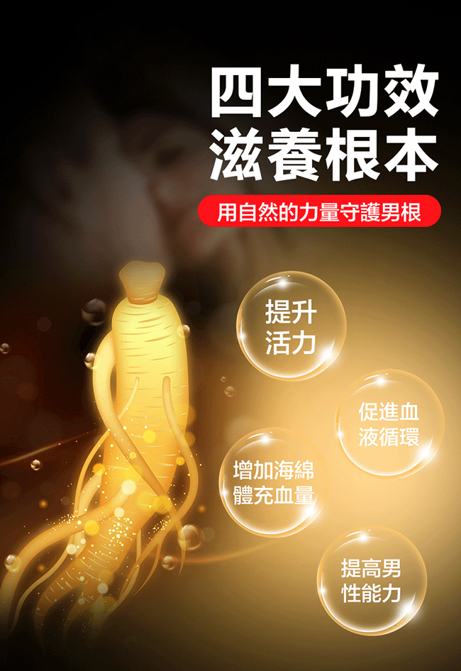 採用古老滋養佳品高麗蔘提取物吸收好、滲透佳,採用自然植物成分黃金配比,刺激男根血液循環激發挺起,讓他粗壯有力,用自然的力量守護男根,讓你快速勃起不傷身。