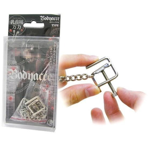 虎鉗式乳夾,以金屬材質制成,雙夾之間以鏈子連接,在這個前提下帶有一定的重量,除了夾痛感,會因為重量帶來拉扯感,富有濃厚的奴隸感!